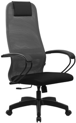 Спинка высокая, эргономичной формы, с ярко выраженной поясничной поддержкой. Спинка имеет сверхпрочный стальной каркас с износостойким полимерным покрытием черного цвета. Спинка снабжена мягким, комфортным подголовником. Сиденье средней жесткости, объемное, на столярном каркасе. Обивка спинки из износоустойчивой "дышащей" сетчатой ткани двойного плетения. Подлокотники стальные классические, с мягкими накладками. Пятилучие пластиковое, прочное. Модель оснащена механизмом качания "Top-Gun" с регулировкой под вес и возможностью фиксации в рабочем положении.