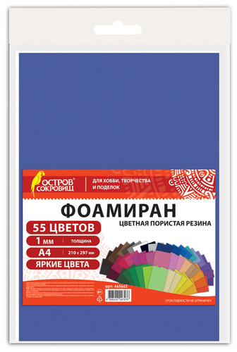 55 интенсивных цветов фоамирана (пористой резины) ОСТРОВ СОКРОВИЩ формата А4 позволят создать уникальную и эффектную поделку! Толщина каждого листа – 1 мм, размер листа – 29,7х21 см.