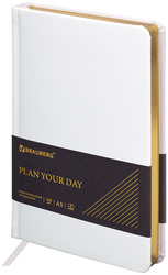Твердая обложка благородного белого цвета стилизована под кожу рептилии. Подходит для горячего тиснения. Срез ежедневника фольгирован золотой фольгой, что придает ему особый шарм. На форзаце располагаются карты России и мира. Дополнением является закладка-ляссе, с помощью которой при необходимости можно быстро открыть ежедневник на нужной странице. Помимо прочего, ежедневник снабжен обширным справочным материалом. В конце ежедневника есть 7 страниц для записей и заметок.