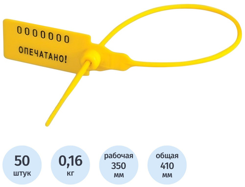 <b>Пломба пластиковая номерная Универсал 350 мм 50 штук в упаковке.</b><BR> Пломба сконструирована так, чтобы попытка вскрытия и повторной установки без видимых повреждений была невозможна. Каждая пломба снабжена маркировкой. Предназначена для опломбирования контейнеров, складских помещений, транспортных средств, торговых и складских помещений, контейнеров, кейсов, аптечек, игровых автоматов, автотранспортных средств и любого другого оборудования.<BR><b>Производителем является ООО ПК Спецконтроль</b>