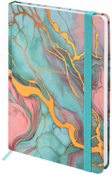 Внутренний блок состоит из 128 листов офсетной бумаги плотностью 60 г/м2. Обложка 7БЦ (твердый переплет с матовой пленкой и тиснением фольгой) обеспечивает долговечность использования. Ежедневник снабжен резинкой-фиксатором, которая предотвращает его случайное открытие в сумке или портфеле.