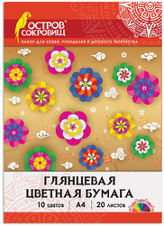 Набор мелованной (глянцевой) односторонней цветной бумаги плотностью 80 г/м2 включает 20 листов формата А4 (200х280 мм) в 10-ти разнообразных и насыщенных однородных цветах. Листы упакованы в картонную папку, легко режутся и сгибаются.