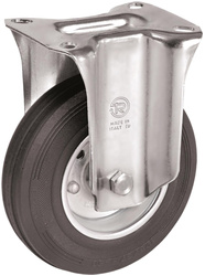 Колесо неповоротное промышленное из черной резины. Жесткость 80 шор А. <nobr>Центр-сердечник</nobr> состоит из двух гальванизированных дисков, соединенный прочными заклепками. Все элементы выполнены из высококачественной стали. Роликовый подшипник расположен в углублении, выдавленном под прессом, и содержит цилиндрические ролики подшипника в обойме из полиамида 6. В ступице используется игольчатый (роликовый) подшипник. Опора с фиксированным кронштейном серии NL. Эта серия широко используется, с любыми тележками и контейнерами, легкой и стандартной грузоподъемности, для строительных лесов, а также для работы вне помещений. Применение: тележки для внутренних и внешних работ на складах и в промышленности, багажные тележки, для строительных лесов, контейнеры для мусора, электрооборудование. Поверхности перемещения: для полов, практически любого типа, даже вне крытых помещений. Позволяют легко преодолеть препятствия, не наносят урон хрупким напольным покрытиям. Температурный диапазон эксплуатации от -20 до 60С.<br><br>Внимание! Набор крепежных элементов (метизы) в комплект поставки не входят. Приобретаются отдельно.