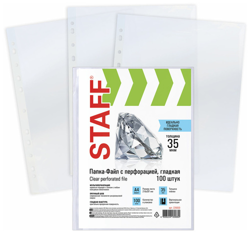 Перфопапки формата А4 с вертикальным размещением содержат универсальную перфорацию, а также имеют гладкую поверхность и прочные швы. Толщина пленки – 35 мкм, что подходит для хранения до 20 листов в 1 папке-файле. В комплекте 100 шт.
