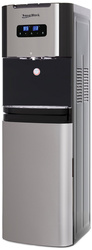 Чёрный корпус с серебристыми вставками выглядит современно и легко вписывается в любой интерьер. Установка бутыли производится снизу, что делает процесс более аккуратным и удобным. Благодаря металлическому каркасу конструкция прочная и долговечная.