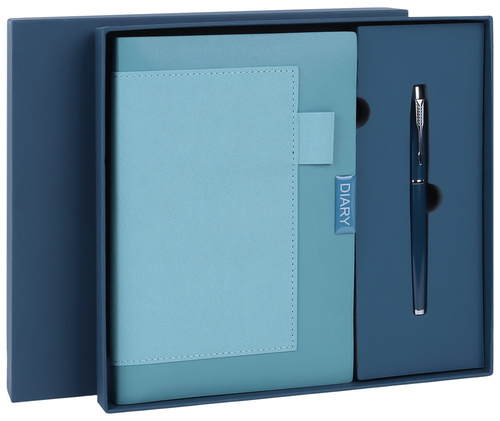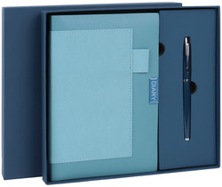 Подарочный набор включает в себя недатированный ежедневник с внутренним блоком из 160 листов кремовой бумаги плотностью 70 г/м2. Каждая страничка имеет перфорированный угол. Благодаря классическому формату А5 (144x210 мм) ежедневник удобно использовать как в офисе, так и на выездных деловых встречах. Гибкая обложка стилизована под текстурную кожу. Дополнениями являются закладка-ляссе и держатель для ручки. Ручка со стильным корпусом в тон ежедневника и высококачественными чернилами также входит в набор.