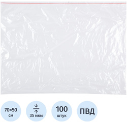 Пакет с замком <nobr>zip-lock</nobr> 70×50 см 35 мкм. Изготовлен из высококачественного полиэтилена с плотностью 35 мкм. Используется в качестве упаковки для: пищевых продуктов, фасовки товара, бытовых вещей, фурнитуры, крепежей, бижутерии. Материал достаточно крепкий: пакет выдерживает многократное использование. Замок <nobr>Zip-Lock</nobr> защищает содержимое от влаги и запахов. В упаковке 100 штук. Пакеты имеют прозрачную застежку и подходят для заморозки продуктов Товар поставляется в ассортименте без возможности выбора цвета.<BR>