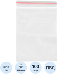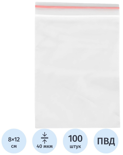 <p>Пакет с замком <nobr>zip-lock</nobr> 8×12 см 40 мкм (ПВД, 100 штук в упаковке) представляет собой пакет из полиэтилена высокого давления (ПВД), одна сторона которого закрывается герметичной защелкой. Герметичная защелка не пропускает влагу, воздух, грязь, не открывается изнутри. Для того, чтобы не повредить верхнюю часть пакета и защелку, пакет следует открывать не растягиванием его сторон в разные стороны, а продольным сдвигом одной стороны, относительно другой. Размер пакета показывает его полезную геометрию. Например, размер пакета 8×12 см, обозначает, что ширина пакета (размер по защелке) равен 8 см, а высота пакета от защелки до дна — 12 см. Пакеты имеют прозрачную застежку. Товар поставляется в ассортименте без возможности выбора цвета. Пакеты используются для упаковки для маркетплейсов.</p>