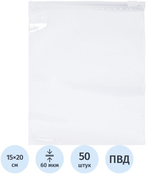 Пакет с замком-слайдером EVA ПВД прозрачный 15×20 см 60 мкм (50 штук в упаковке)<br>Универсальный пакет из качественного материала с удобным замком-слайдером, идеально подходящий для упаковки, хранения и транспортировки широкого спектра товаров.<br><b>Ключевое преимущество: </b> согласно сертификации, пакеты изготовлены из безопасных для прямого контакта материалов: пищевая продукция, детские товары, медицина. <br><b>Особенности и преимущества: </b><br>• Надёжный замок-слайдер: эффективно предохраняет содержимое от влаги, пыли и грязи.<br>• Комплексная защита содержимого: Пакеты размером 15×20 см и толщиной 60 мкм обеспечивают превосходную сохранность содержимого от влаги, пыли и механических повреждений. <br>• Наглядность и контроль: Прозрачный материал позволяет легко идентифицировать содержимое пакета без необходимости вскрытия.<br>• Удобство в использовании: Гладкая поверхность пакета позволяет легко наклеивать адресные этикетки и маркировку.<br><br><b>Технические характеристики: </b><br>• Размер: 15×20 см.<br>• Толщина: 60 мкм.<br>• Количество в упаковке: 50 штук.<br><br><b>Обратите внимание: </b> Производитель оставляет за собой право вносить изменения во внешний вид и/или характеристики товара в соответствии с производственным процессом.