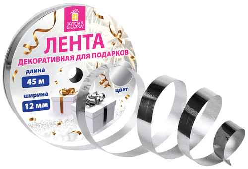 Лента шириной 12 мм и длиной 45 м изготовлена из прочного полипропилена (70%) и полиэтилена (15%) и полиэтилентерефталата (15%). Толщина ленты 130 мкм (0,13 мм). Цвет ленты - серебристый металлик. Лента намотана на картонную бабину и упакована в термоусадочную пленку, поверх которой есть стикер с краткой информацией о товаре.