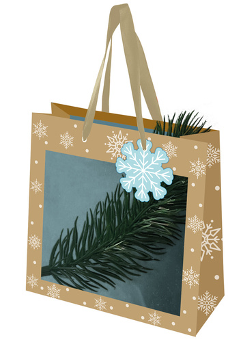Пакет изготовлен из крафт-бумаги, украшенной нежными узорами снежинок, снабжен ленточными ручками из полиэстера. Размер – 20x8x20 см. Внутри пакет выполнен в светло-голубом цвете. С лицевой стороны пакета – прозрачное "окно", через которое виден голубой цвет внутренней части пакета – оригинальный акцент, привлекающий внимание.