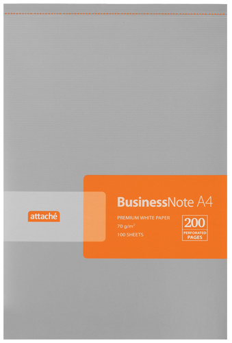 Блокнот Attache Микроперфорация формата A4 предназначен для офисных записей и работы с документами. Размер листа составляет 20×29.7 см, что соответствует стандарту A4 и удобно для подшивки и систематизации материалов.<br><br>Обложка выполнена из мелованного картона с ламинацией и оформлена в серебристом цвете с печатью серебром, что подчёркивает строгий деловой стиль изделия. Плотность обложки составляет 200 г/кв.м, дополнительно используется подложка из плотного картона, повышающая жёсткость конструкции. Крепление блока выполнено методом склейки и расположено сверху.<br><br>Внутренний блок состоит из 100 листов офсетной бумаги плотностью 70 г/кв.м. Бумага белого цвета с белизной 100% разлинована в клетку насыщенным серым цветом. Листы оснащены микроперфорацией и четырьмя отверстиями для размещения в папках с кольцами, что упрощает аккуратное извлечение и дальнейшую работу с документами. Размер блока соответствует 20×29.7 см. Цвет обреза — белый. Блокнот произведён в России и поставляется по 1 штуке.