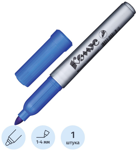 Особая нестираемая основа перманентного маркера Комус синего цвета обеспечивает такие качества, как стойкость к воздействию воды, ультрафиолета, низких и высоких температур. Можно маркировать, среди прочего, пластмассовые, деревянные, металлические, стеклянные или картонные предметы. Цвет колпачка соответствует цвету чернил. Фетровый, круглый, эластичный наконечник обладает повышенной износостойкостью и обеспечивает экономный расход чернил. Отличается продлённой линией письма. Изделие не перезаправляется. Плотно закрывается колпачком, что предотвращает высыхание наконечника и чернил. Толщина линии письма — 1-4 мм в зависимости от угла наклона. Спиртовая основа быстросохнущих чернил. Круглая форма корпуса из пластика. Перманентный маркер Комус должен быть всегда под рукой!<br><br><b>Рекомендуется хранить в горизонтальном положении или колпачком вниз в вертикальном положении.</b>