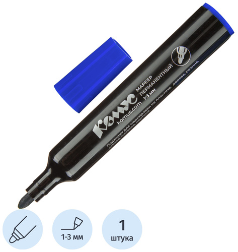 <p>Маркер перманентный Комус в прочном пластиковом корпусе. Нестираемые светостойкие чернила на спиртовой основе, не содержат ксилол и толуол. Идеально подходит для надписей на металле, пластике, дереве и картоне, а также резине, стекле. Прочный акриловый наконечник круглой формы позволяет провести линию толщиной от 1 до 3 мм. Цвет — синий. Длина линии письма — 300 м.</p>