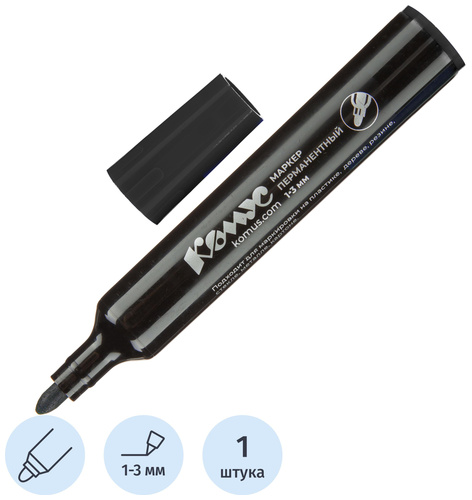<p>Маркер перманентный Комус в прочном пластиковом корпусе. Нестираемые светостойкие чернила на спиртовой основе, не содержат ксилол и толуол. Идеально подходит для надписей на металле, пластике, дереве и картоне, а также резине, стекле. Прочный акриловый наконечник круглой формы позволяет провести линию толщиной от 1 до 3 мм. Цвет — черный. Длина линии письма — 300 м.</p>
