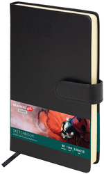 Благодаря компактному формату скетчбук можно носить с собой, а жесткая обложка станет верным подспорьем для рисования на весу. Дополнением является закладка-ляссе, с помощью которой при необходимости можно быстро открыть скетчбук на нужной странице, и держатель для письменных принадлежностей. Магнитная застежка надежно сбережет листы от замятия и случайного раскрытия. На задней обложке расположен карман для мелочей.
