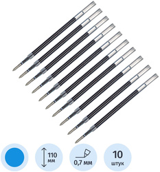 Стержень для гелевой ручки с чернилами синего цвета, толщина линии письма - 0.7 мм, длина стержня - 110 мм. Поставляется в упаковке по 10 штук.<br>Подходит для артикулов 218851, 325673.<br>Внимание! Для самостоятельного подбора расходных материалов необходимо учитывать не только длину корпуса стержня, но и другие параметры: внутренний диаметр ручки, диаметр отверстия ручки и наконечника стержня, расстояние между пишущим узлом и 'ушками' (при наличии), поэтому рекомендуется проверять совместимость ручки и стержня вручную.