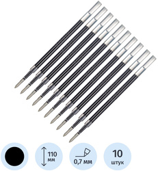Стержень для гелевой ручки с чернилами чёрного цвета, толщина линии письма - 0.7 мм, длина стержня - 110 мм. Поставляется в упаковке по 10 штук.<br>Внимание! Для самостоятельного подбора расходных материалов необходимо учитывать не только длину корпуса стержня, но и другие параметры: внутренний диаметр ручки, диаметр отверстия ручки и наконечника стержня, расстояние между пишущим узлом и 'ушками' (при наличии), поэтому рекомендуется проверять совместимость ручки и стержня вручную.
