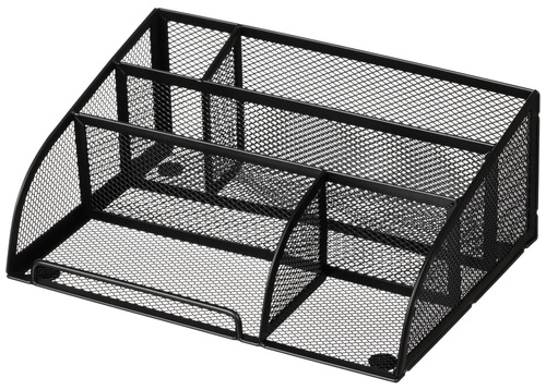 Подставка-органайзер предназначена для хранения канцелярских мелочей и помогает навести порядок на рабочем месте. В неё удобно складывать ручки, маркеры, стикеры, кнопки и другие офисные принадлежности.Изделие выполнено из металлической сетки и имеет 5 отделений для сортировки. Конструкция устойчивая и компактная, подходит для настольного использования. Модель не вращается.