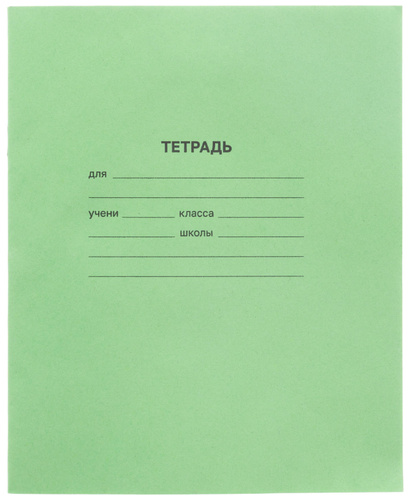 Тетрадь школьная зелёная А5 12 листов в линейку<br> <br> Зелёная школьная тетрадь подходит для записей и заданий по русскому языку. Она подойдёт как для использования школьниками или студентами, так и для ведения записей в быту.<br> <br> Формат листов — А5, размер тетради: 16.5×20.5 см. Обложка из офсетной бумаги плотностью 80 г/кв.м устойчива к износу и долго сохраняет аккуратный вид. Внутренний блок сделан из офсетной бумаги плотностью 60 г/кв.м, белизна: 100%. Текст на нём выглядит чётким и легко читается даже при использовании ручек со светлыми или цветными чернилами. Двенадцать листов надёжно скреплены скобами.<br> <br> Синяя линовка в линию с полями помогает оформлять записи ровно и аккуратно. Тетрадь продаётся поштучно.