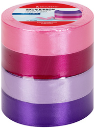 Изделие представляет собой набор из атласных лент, изготовленных из 100% полиэстера, с ткаными кромками на обоих краях. Кромка на краях лент выполнена с применением полиэстеровой нити. Ленты изготовлены с применением саржевого способа переплетения нитей. В набор входит 4 ленты розового, малинового, сиреневого и фиолетового цветов шириной 25 мм (± 3%) и длиной 23 м, каждая из которых намотана на втулку из пенополистирола. Набор лент упакован в термоусадочную пленку, содержащую этикетку с краткой информацией о товаре.