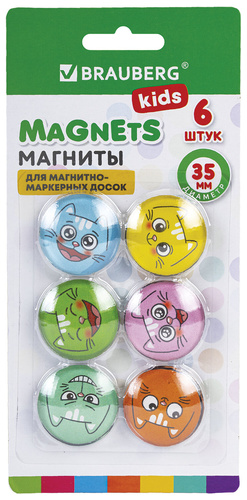Магниты круглой формы выполнены из полистирольного стекла. Диаметр магнита составляет 35 мм. 6 штук в комплекте. Надежно удерживаются на любой железной или стальной поверхности. Упаковка – блистер с европодвесом.
