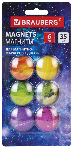 Магниты круглой формы выполнены из полистирольного стекла. Диаметр магнита составляет 35 мм. 6 штук в комплекте. Надежно удерживаются на любой железной или стальной поверхности. Упаковка – блистер с европодвесом.