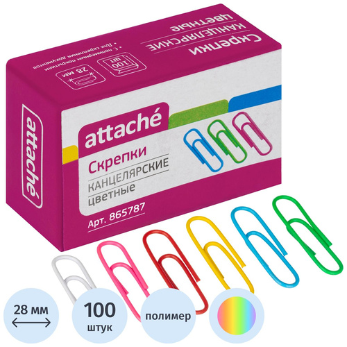 Скрепки Attache незаменимы при работе в офисе или дома, когда нужно соединить несколько бумаг, например, все листы договора или другие важные документы. Металлические с цветным покрытием из пластикового полимера. Имеют закругленную форму, что позволяет надежно скреплять документы. Разноцветные. Длина 28 мм. В упаковке 100 скрепок.