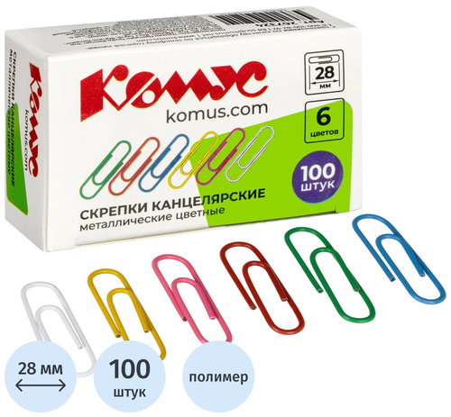 <p>Скрепки Комус незаменимы при работе в офисе или дома, когда нужно соединить несколько бумаг, например, все листы договора или другие важные документы. Скрепки изготовлены из металла с цветным покрытием из пластикового полимера. Имеют удобную закругленную форму, что позволяет надежно скреплять документы. Размер — 28 мм. Разноцветные. Упакованы в картонную коробочку по 100 штук.</p>