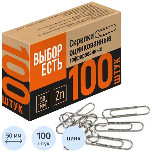 Скрепки канцелярские 50 мм Выбор есть (Attache Economy) стальные оцинкованные (100 штук в упаковке)<br><br>Скрепки Выбор есть незаменимы при работе в офисе или дома, когда нужно соединить несколько бумаг, например, все листы договора или другие важные документы. Канцелярские скрепки изготовлены из стали, имеют цинковое покрытие, гофрированные. Форма скрепок — овальная. Они надёжно скрепляют документы, не повреждая их. Скрепки имеют размер 50 мм.<br>Упакованы по 100 скрепок в картонную упаковку.<br><br>В рамках ребрендинга производится перевод данного артикула с ТМ Attache Economy на ТМ Выбор есть с сохранением всех потребительских характеристик товара. На переходный период допускается поставка данной продукции в разных вариантах дизайна.