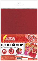Плотность - 160 г/м2 и толщина в 1 мм гарантируют поделкам отличное качество и долгий срок службы. Цветной фетр формата А4 поставляется в упаковке по 10 листов, в 10 различных оттенках красного цвета. Такое разнообразие придется по вкусу любому покупателю. Фетр Остров Сокровищ обладает приятной нежной фактурой, прост и удобен в использовании. Края не осыпаются при разрезании, благодаря чему не нуждаются в дополнительной обработке.