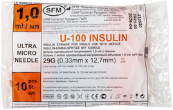 1 мл, комплект 10 шт., пакет, U-100 игла несъемная 0,33х12,7 мм - 29G, 10 шт/уп