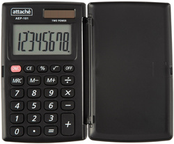 Калькулятор Attache карманный AEP-101 с крышкой с 8-разрядным ЖК-дисплеем. Подходит как для использования в школе, так и в любых универсальных целях.<br> Эргономичная форма панели и достаточно крупные клавиши создают максимальный комфорт в использовании. Оптимальный и необходимый набор функций, среди которых: MRC, M+, M-, расчет процентов. Функция коррекции вычислений: нет. Пересчет курса валюты: нет. В калькуляторе имеется два источника питания: батарейка типа LR1130 (входит в комплект) и солнечная батарея. <br> Размер калькулятора: 104×63×11 мм. Материал корпуса: пластик. Материал клавиатуры: резина. Вес: 0.05 кг. Цвет: черный. Гарантийный срок: 12 мес.