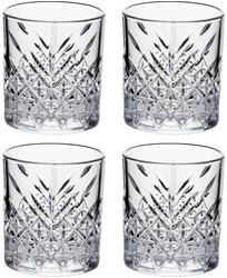 Набор стаканов (рокс) Pasabahce Таймлесс 345 мл (4 штуки в упаковке) <br><br>Набор стаканов из прозрачного стекла предназначен для подачи виски, бренди и других крепких напитков. Изделия выполнены в форме рокс, которая обеспечивает удобное удержание и гармонично сочетается с классической сервировкой. <br>Объём каждого стакана составляет 345 мл, высота — 8.5 см, диаметр — 7.2 см. Элегантная гравировка придаёт посуде изысканный вид и делает её оригинальным элементом стола. <br>Стаканы устойчивы к повреждениям и подходят для мытья в посудомоечной машине, однако не предназначены для использования в СВЧ-печи. <br>В набор входит 4 стакана.