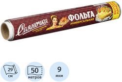 Фольга пищевая алюминиевая Саянская фольга Саяночка 29 см х 50 м (толщина 9 мкм). <br>Фольга подходит для упаковки и хранения. Сохраняет свежесть и аромат, предотвращает высыхание.<br>Толщина: 9 мкм. <br>Длина намотки: 50 м. <br>Ширина: 29 см.