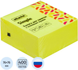 Стикеры Attache Simple в формате 76×76 мм, желтого цвета, состоят из 400 листов, упакованных в пленку. Тон стикеров — неоновый. Плотность бумаги: 70 г/кв.м. Клейкий слой — 16 Н/м. Идеально подойдут для сотрудников творческих профессий и руководителей: рекомендуются для использования в процессе совещаний, обучения, мозговых штурмов. Длина клейкой стороны 76 мм.<br>Особых условий хранения не требует, сертификации не подлежит, срок годности не ограничен.<br><br>Чтобы увеличить срок службы стикеров, пожалуйста, следуйте рекомендациям:<br>1) Отделять стикер от блока следует вдоль клеевой полосы. Так можно избежать скручивания и последующего отклеивания стикера.<br>2) Прежде чем наклеивать стикер, убедитесь в отсутствии грязи и пыли на поверхности. На чистой поверхности срок службы клеевого слоя более продолжителен.