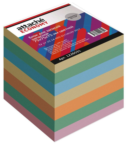 Блок для записей Attache предназначен для работы в офисе или дома. Будет полезен в использовании для рабочих процессов и повседневных задач. Отлично подходит для работников офиса.<br><br>Блок высотой 7,5 см сложен из квадратных листов размером 7,5×7,5 см . Листы не склеены между собой. Листы изготовлены из белой офсетной бумаги плотностью 65 г/м2. В блоке представлены листы пяти цветов: желтого, голубого, зеленого, оранжевого, розового. Блок для записей подходит для письма любыми типами ручек и карандашей. Поставляется в термоусадочной пленке, защищающей блок при транспортировке. Для повышения удобства рекомендуется использование в пластиковых подставках и настольных органайзерах.<br><br>В рамках ребрендинга производится перевод данного артикула из ТМ Attache Economy в ТМ Attache с сохранением всех потребительских свойств товара. Во время переходного периода допускается поставка данной продукции в двух вариантах дизайна упаковки.