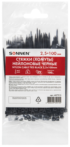 Стяжки (хомуты) нейлоновые SONNEN обеспечивают надежное, быстрое и экономичное крепление. Они просты и удобны в использовании: большим пальцем левой руки прижмите замок к пучку, а правой рукой затяните петлю, вставьте конец затяжки в замок и затяните до полной фиксации, после чего отрежьте выступающую часть бандажа. Не рекомендуется перегибать бандаж при затяжке.