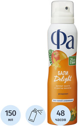Дезодорант-антиперспирант женский Fa Ритмы Острова Бали Delight спрей 150 мл<br><br>Почувствуй заряд свежести, погрузись в мир экзотического путешествия с тропическим ароматом манго и цветка ванили.<br>— Женский аэрозоль дезодорант.<br>— До 48 часов део-защиты без солей алюминия.<br>— Эффективно борется с бактериями, вызывающими неприятный запах пота.<br>— Дерматологически протестирован, бережная к коже формула, с технологией против пятен.<br>— Веган формула: не содержит ингредиентов животного происхождения.<br><br>Состав: Butane, Alcohol denat., Propane, Isobutane, Parfum (Fragrance), Propylene Glycol, Triethyl Citrate, Phenoxyethanol, 1.2-Hexanediol, Caprylyl Glycol, Cocamidopropyl PG-Dimonium Chloride Phosphate, Menthyl Acetate, Limonene, Hexyl Cinnamal, Linalool, Citronellol, Benzyl Alcohol.
