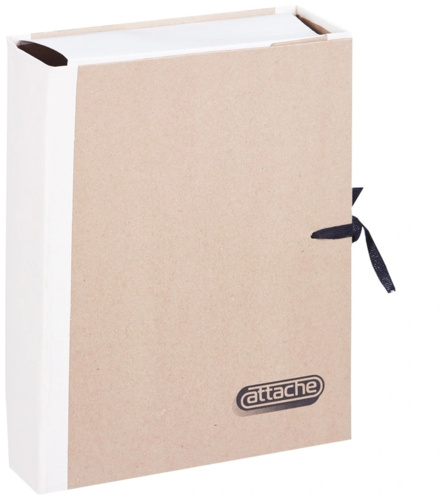 Архивная папка Attache формата А4 выполнена из плотного картона, обтянутого крафт-бумагой. Корешок шириной 50 мм — из коленкора (переплетная хлопчатобумажная ткань). В закрытом виде фиксируется с помощью четырех завязок. Вмещает до 450 листов стандартной плотности. Толщина картона 1,25 мм. Размер изделия — 310×50×230 мм.
