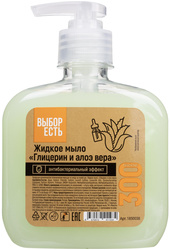 Мыло жидкое Выбор есть Глицерин и алоэ вера 300 мл<br><br>Назначение: мыло с антибактериальным эффектом очищает и смягчает кожу.<br>Продукция косметическая гигиеническая моющая по уходу за кожей рук.<br>Состав: Aqua, Sodium Chloride, Sodium Laureth Sulfate, Cocamide DEA, Styrene/Acrylates Copolymer, Parfum, Glycerin, Triclosan, DMDM Hydantoin, Methylchloroisothiazolinone, Methylisothiazolinone, C.I. 19140, C.I. 42090.<br>Область применения: использовать по назначению — в быту, кафе, ресторанах, комбинатах общественного питания, лечебно-профилактических, учебных и детских учреждениях.<br>Меры предосторожности:<br>Использовать только по назначению! Хранить в недоступном для детей месте. При попадании мыла в глаза немедленно промыть их чистой водой.<br>Условия хранения:<br>Хранить вдали от пищевых продуктов, нагревательных и осветительных приборов и прямых солнечных лучей при температуре не ниже +5 °С и не выше +25 °С.<br>Срок годности: 24 месяца.