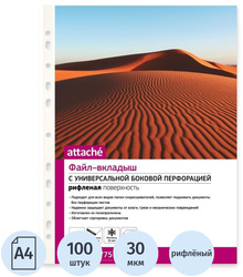 <nobr>Файл-вкладыш</nobr> Attache формата А4, предназначенный для хранения и защиты печатных документов. Поверхность рифленая. Позволяет копировать документы, не вынимая их из папки. Изготовлен из полипропиленовой пленки (толщина 30 мкм). Внутренний размер 303×215 мм. Боковая перфорация подходит для разных типов скоросшивателей. В упаковке содержится 100 файлов. Каждый<nobr>файл-вкладыш</nobr> вмещает около 40 листов стандартной плотности. Нанесение логотипа возможно только на перфорации, на самом файле нет. Стоимость указана за упаковку.</p> В рамках обновления дизайна упаковки с сохранением всех потребительских характеристик товара, допускается поставка данной продукции в двух вариантах дизайна упаковки.