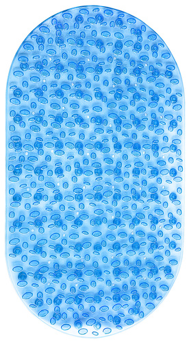 Противоскользящий коврик для ванны изготовлен из прочного ПВХ-материала. Размер: 69х40 см. Форма: овал. Рисунок: камешки. По всей задней поверхности коврика равномерно распределены присоски. Мягкая фактурная поверхность с выступами обеспечивает дополнительный массажный эффект для ступней.