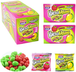 Состав: сахар, глюкозный сироп, загуститель (кукурузный крахмал), пальмовое масло, регуляторы кислотности (лимонная кислота, яблочная кислота), пищевые ароматизаторы (манго, малина), красители Е129, E102, Е133,Е171. Без ГМО.