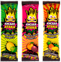 Сладости упакованы в яркую индивидуальную упаковку в стиле кислотного стрит-арта. Жёлтая рожица на упаковке выражает весь спектр взрывных эмоций от неожиданно кислого вкуса. Ассорти вкусов можно заказать только блоком, в котором 48 жевательных конфет.