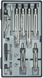 В набор входят: - Циркуль чертежный, длина 155 мм, нержавеющий металл; - Циркуль чертежный малый; - Циркуль чертежный с падающей иглой; - Кронциркуль, 2 шт.; - Циркуль разметочный; - Циркуль разметочный малый; - Удлинитель; - Вставка игольная; - Вставка карандашная малая; - Отвертка-пенал; - Гайка; - Запасной винт.