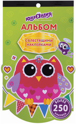 Альбом из 4 фигурных листов на склейке содержит более 250 разных наклеек с совятами. В альбоме 2 листа с красочными наклейками и 2 листа со сверкающими, переливающимися наклейками, которые можно использовать для украшения тетрадей, дневника, блокнотов, а также для создания аппликаций и поделок.