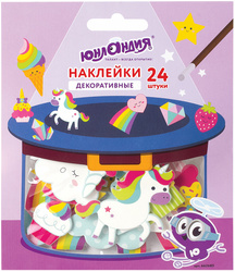 В наборе содержится 24 объёмных наклейки из мягкого пластика (ЭВА) в виде единорогов, радуги, облаков. Наклейки отличаются высочайшим качеством печати и цветопередачи. Стильные и яркие, они украсят тетрадь, дневник, блокнот с записями и любые поделки! Наклейки упакованы в пакет, помещенный внутрь стильного картонного рукава с окошком. На обратной стороне картонной упаковки размещены все дизайны, входящие в набор.