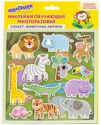 В набор входит 12 крупных объемных наклеек в виде различных животных Африки, а также картонное поле размером 20*40 см (поставляется в сложенном виде) с определенными местами для нанесения наклеек. Место для каждой наклейки на поле подписано соответствующим образом, например, лев, жираф, зебра и т.д. Таким образом, в ходе игры ребенок знакомится с названием и внешним видом животного.