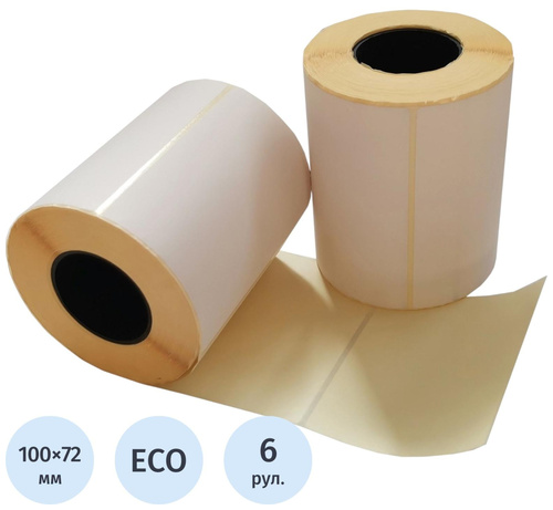 Термоэтикетки 100×72 мм ЭКО 40 мм диаметр втулки (6 рулонов по 500 этикеток)<br><br>Термоэтикетки без печати белого цвета изготовлены из материала Thermal ECO (ЭКО). Рулон с втулкой диаметром 40 мм содержит 500 плюс-минус 5 этикеток. Самоклеящиеся термоэтикетки применяются для нанесения веса, штрихкодов, цен и другой информации, маркировки товаров недлительного хранения. Потенциальные потребители — супермаркеты, производство, центры техобслуживания кассовых аппаратов, снабжающие компании, компании по поставке упаковочных материалов, предприятия, занимающиеся фасовкой продукции и т. д. Не рекомендуется использовать для маркировки «сложных» поверхностей (камень, металл и др.)<br><br>Термоэтикетки предназначены для печати на термопринтерах в режиме прямой термопечати (Direct Termal, печать с помощью термоголовки).